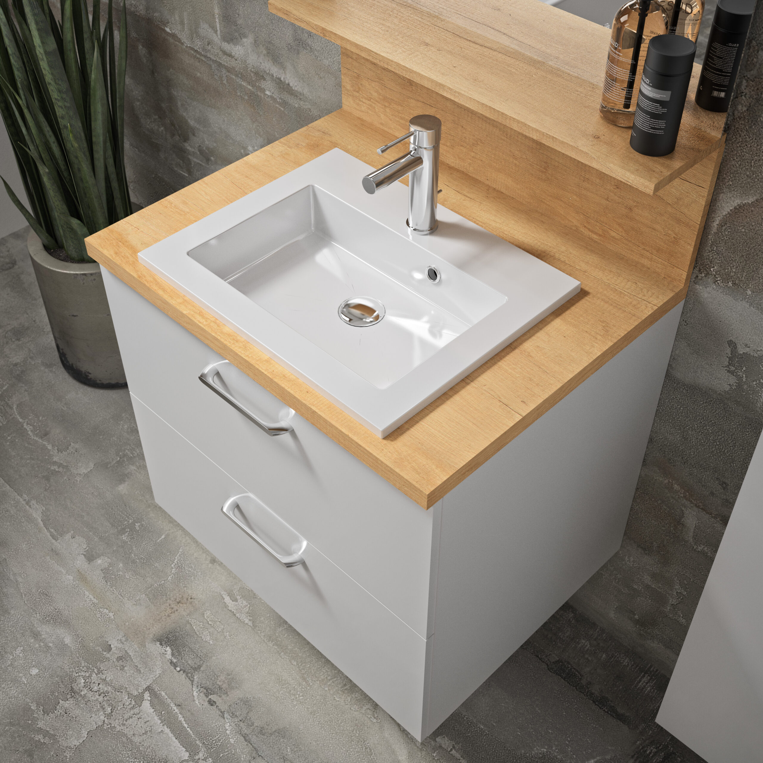 Corps et façades réalisés en PPSM ép.16 mm, 2 faces décors et chants plaqués assortis. 2 tiroirs coulissants à fermeture progressive. Tiroir haut avec découpe pour passage siphon. Vide sanitaire de 166 mm. Façades avec pré-perçages poignées. Poignées métal chromé brillant incluse.